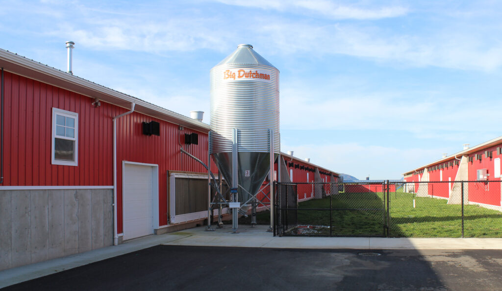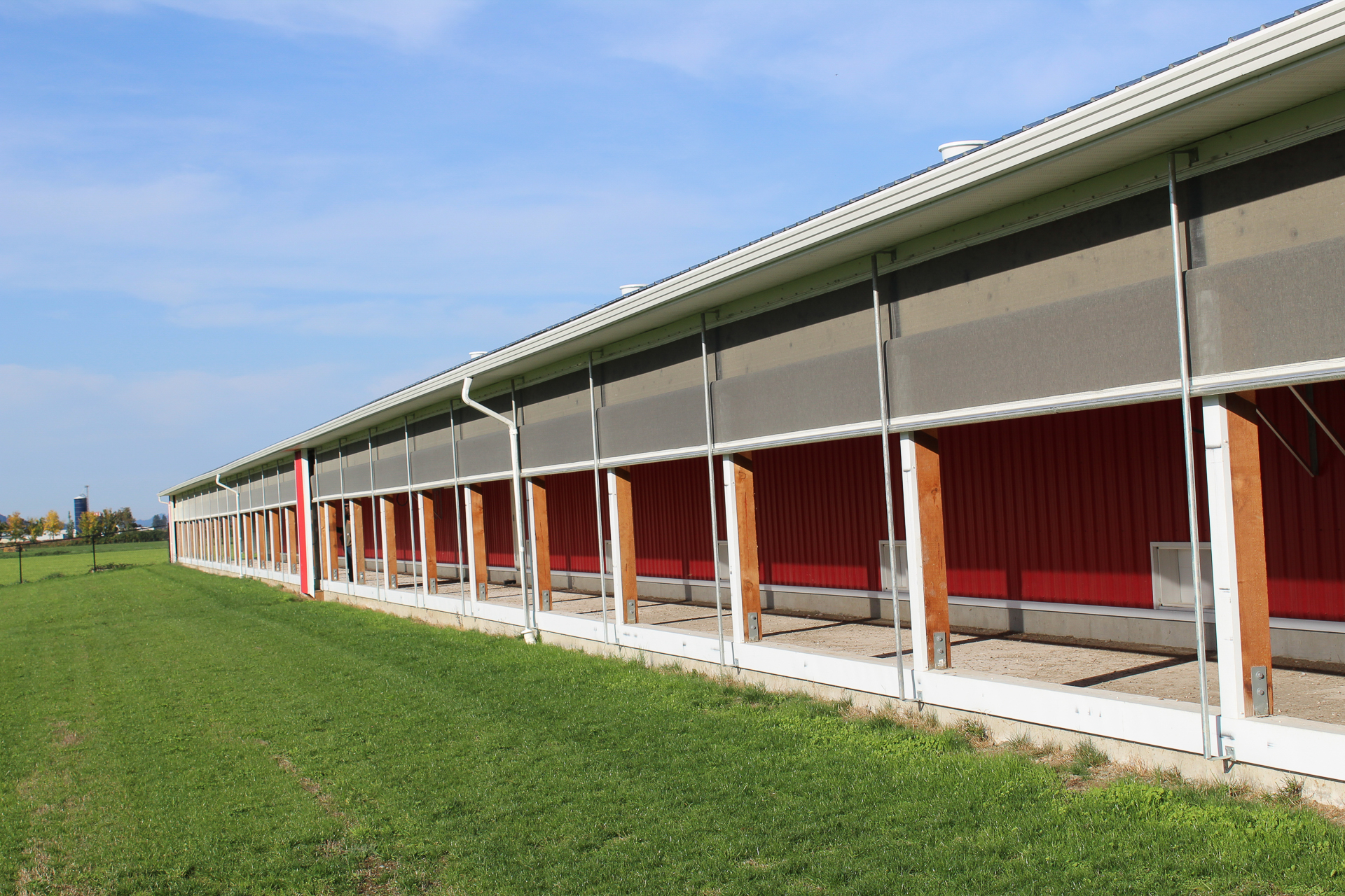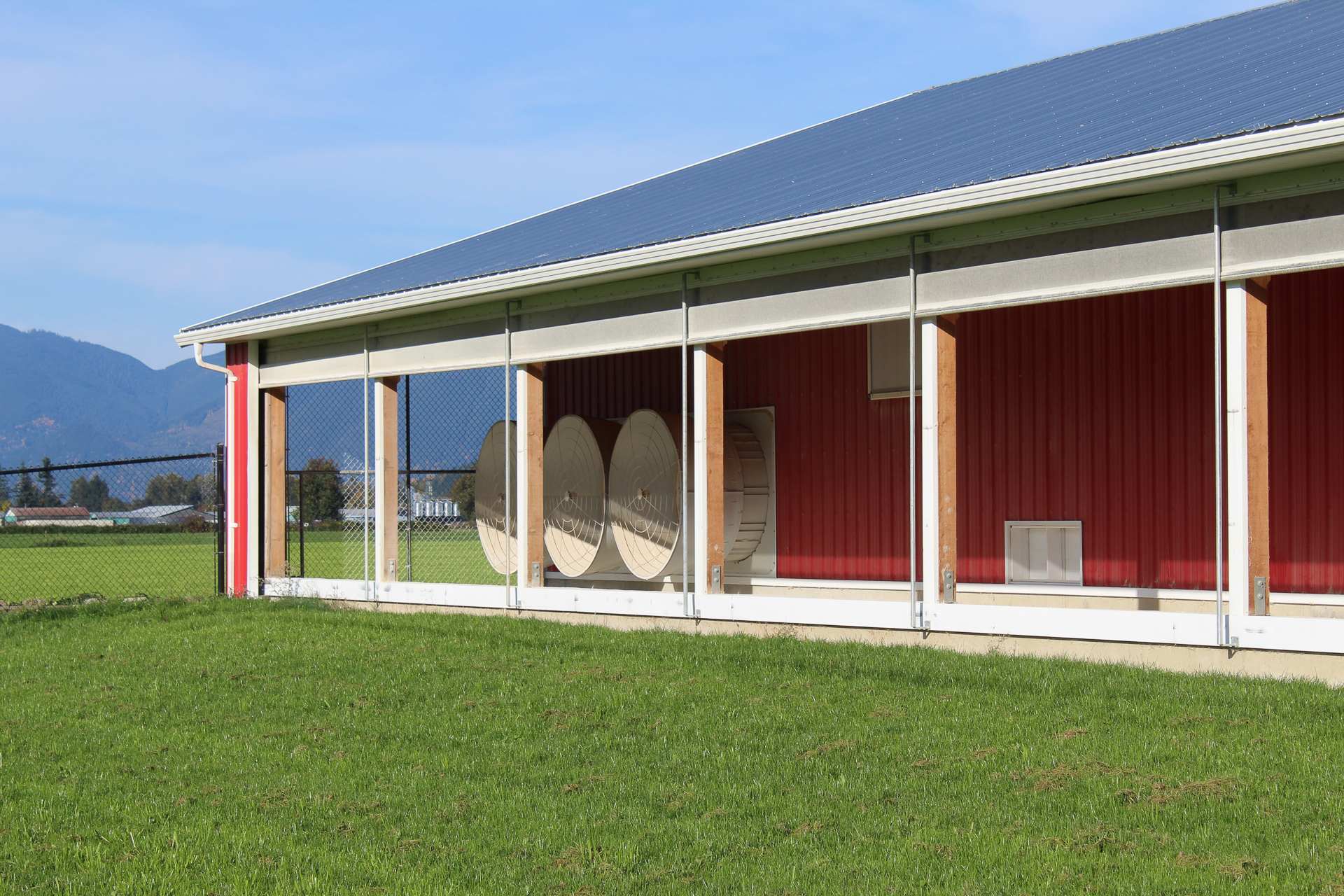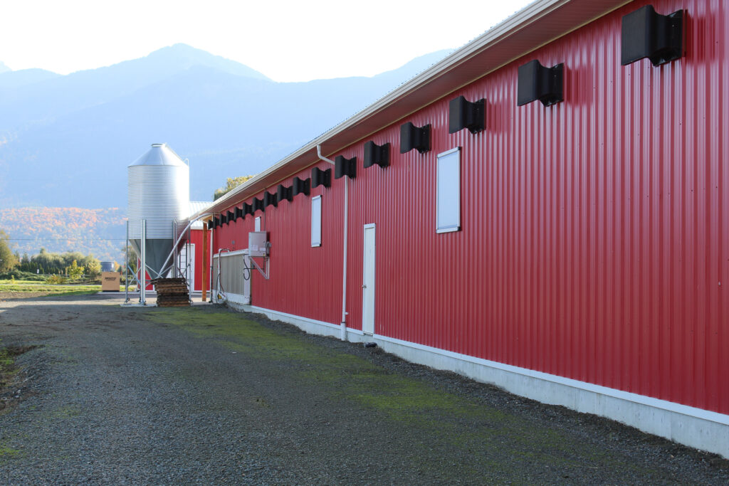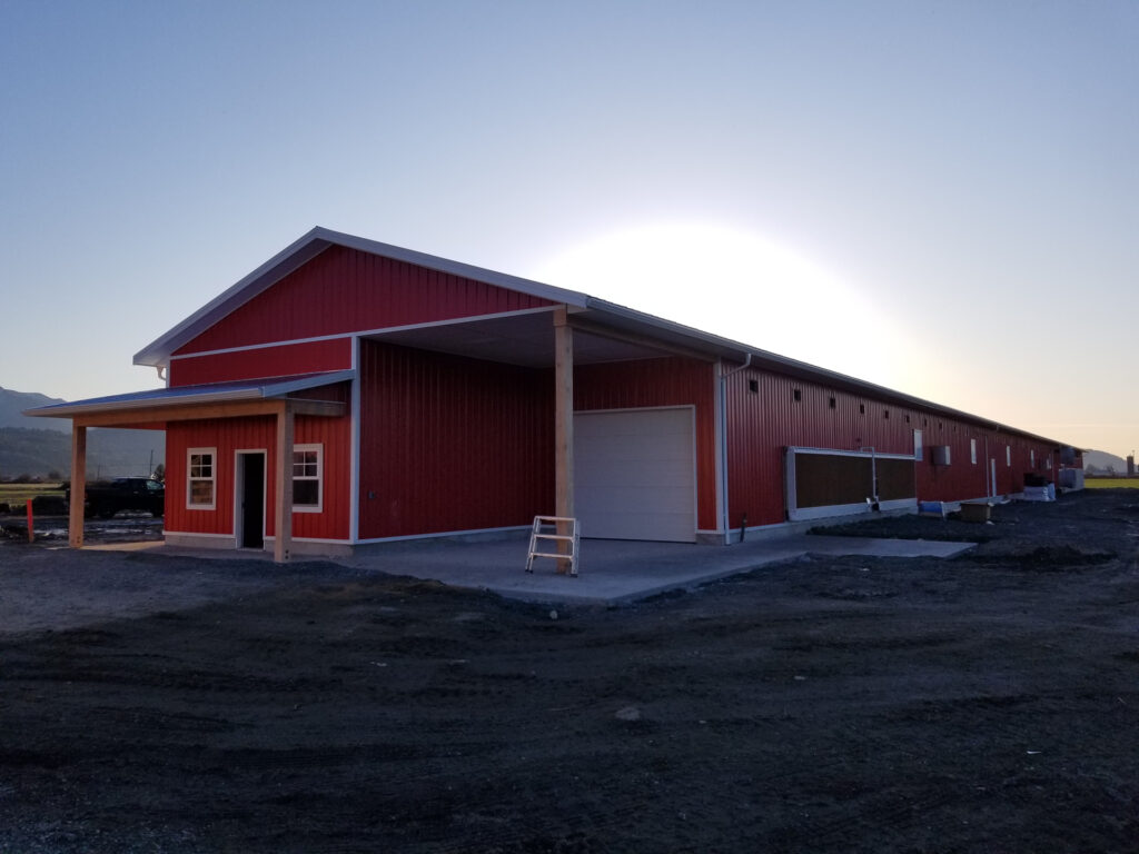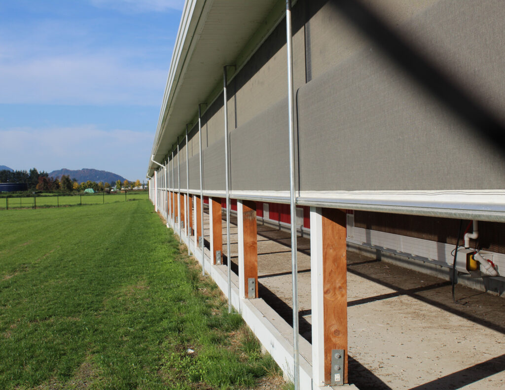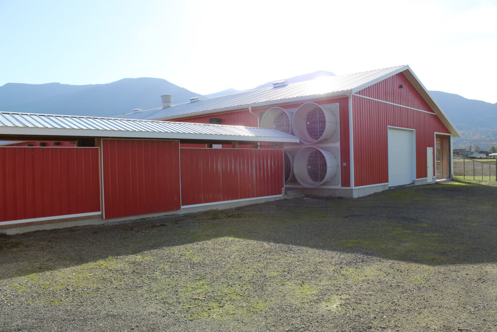 This barn uses a long, narrow layout that supports efficient airflow and large flock capacity. The metal siding and steel roof are durable, washable, and moisture-resistant, while the raised concrete base improves drainage, pest control, and long-term stability. Deep roof overhangs and a covered entry protect doors and reduce weather exposure.