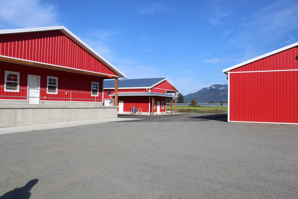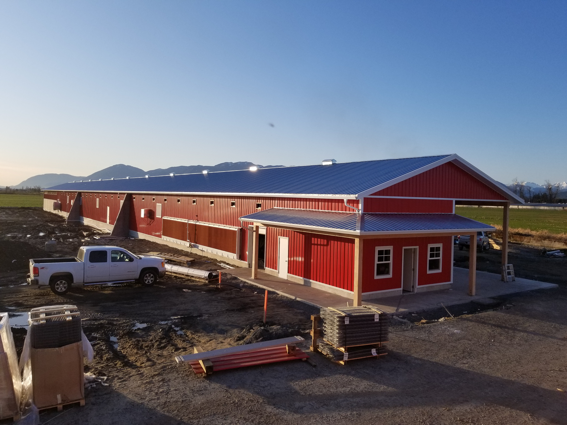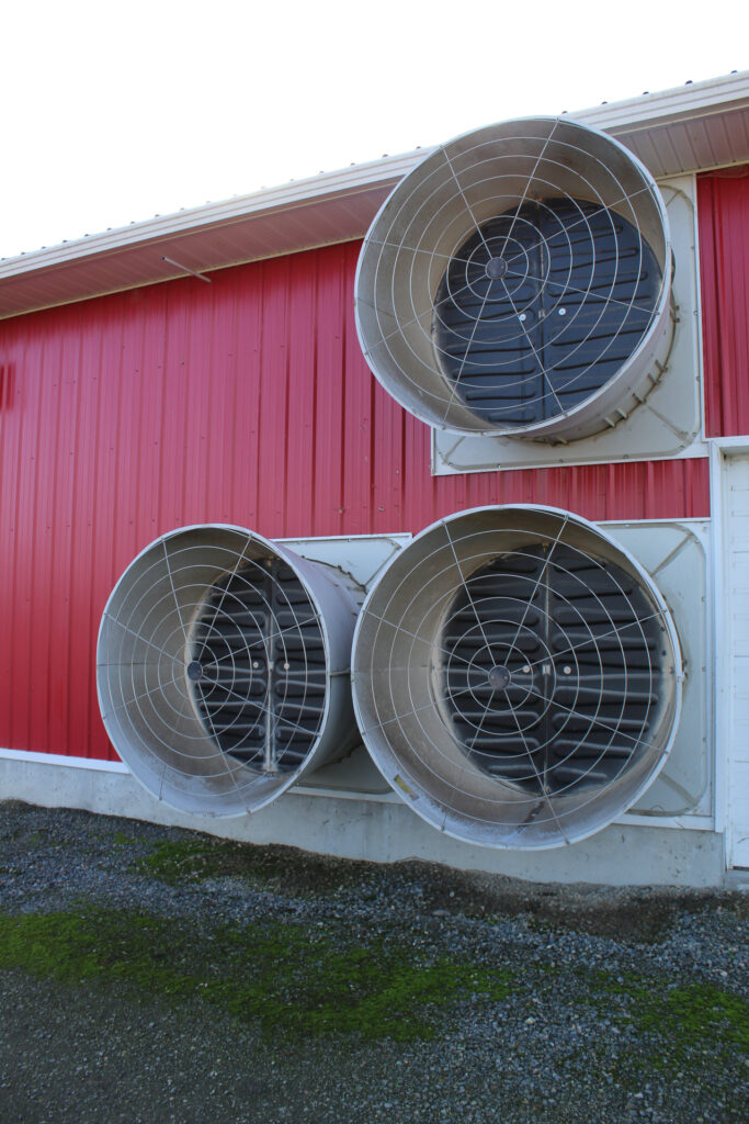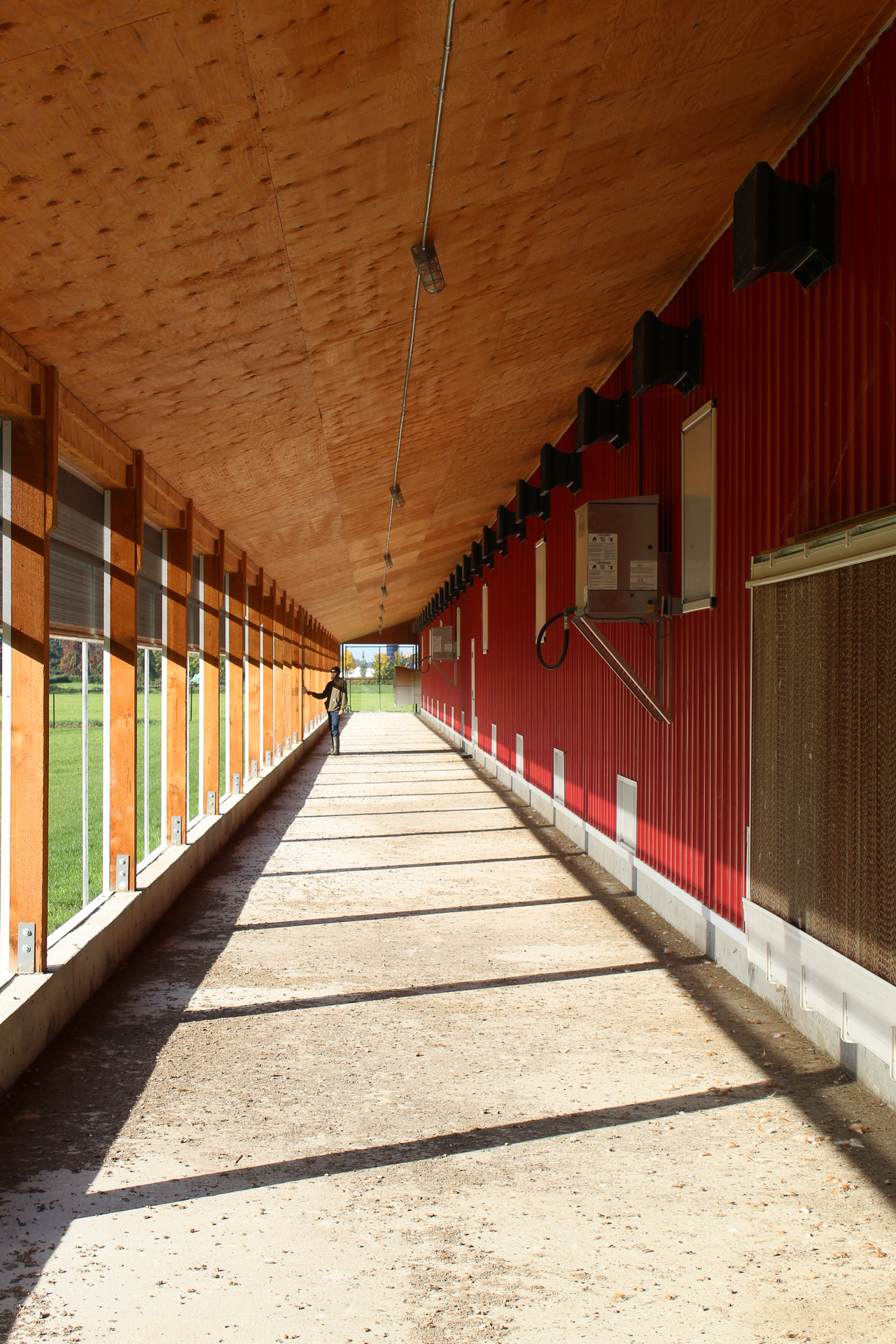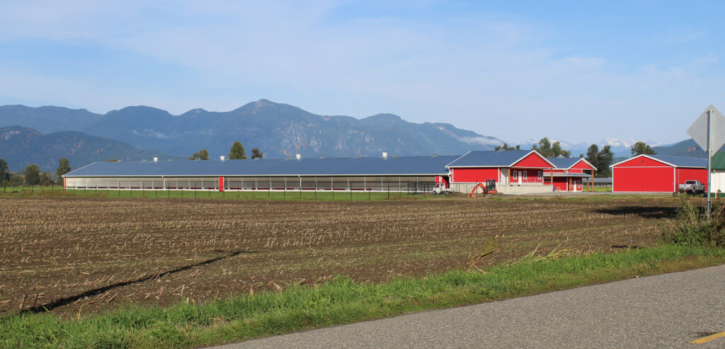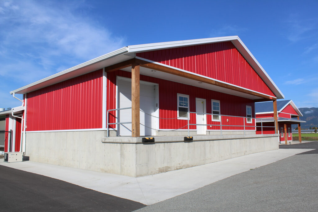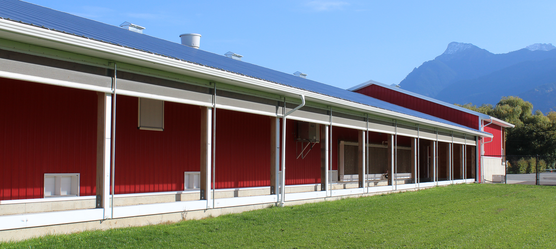 This barn uses a long, narrow layout that supports efficient airflow and large flock capacity. The metal siding and steel roof are durable, washable, and moisture-resistant, while the raised concrete base improves drainage, pest control, and long-term stability. Deep roof overhangs and a covered entry protect doors and reduce weather exposure.